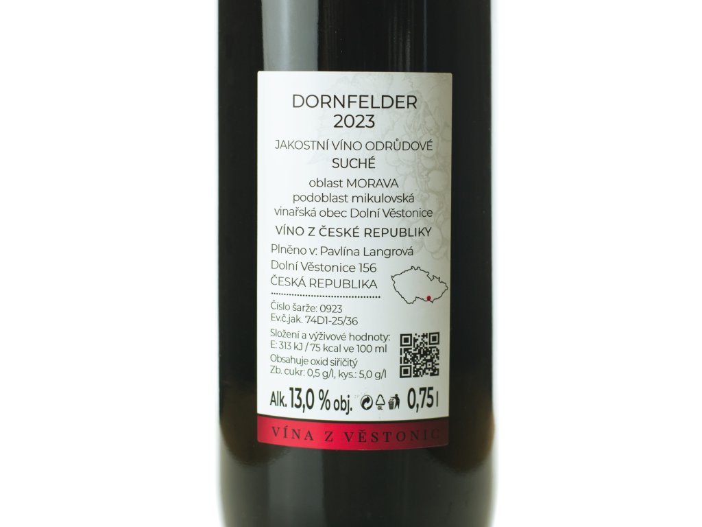 Dornfelder 2023 je suché červené víno z Dolních Věstonic, které vás okouzlí svou intenzivní barvou a bohatou chutí. S náznaky červeného ovoce a koření, je to dokonalý společník k masovým pokrmům i večerům s přáteli.