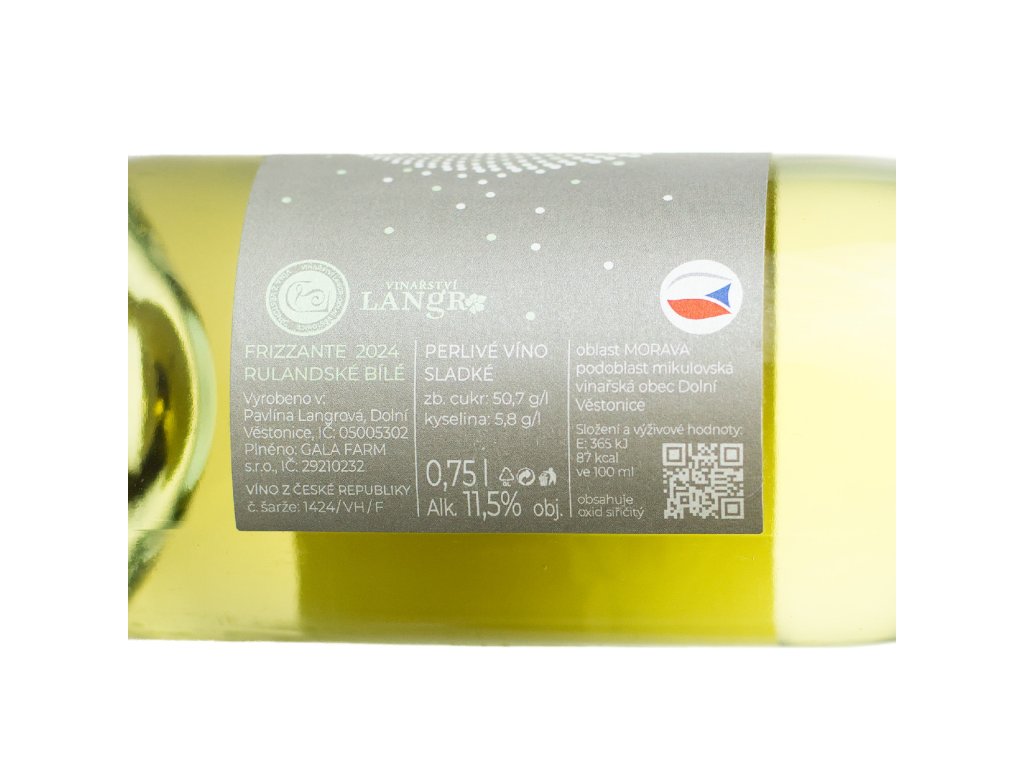 Frizzante z Rulandského bílého 2024 z Dolních Věstonic je sladké perlivé víno, které zaujme svou jemnou sladkostí a šumivou texturou. Ideální volba pro slavnostní okamžiky i každodenní radovánky. Vyváženost cukru a kyselinek dodává vínu překvapivý nádech.