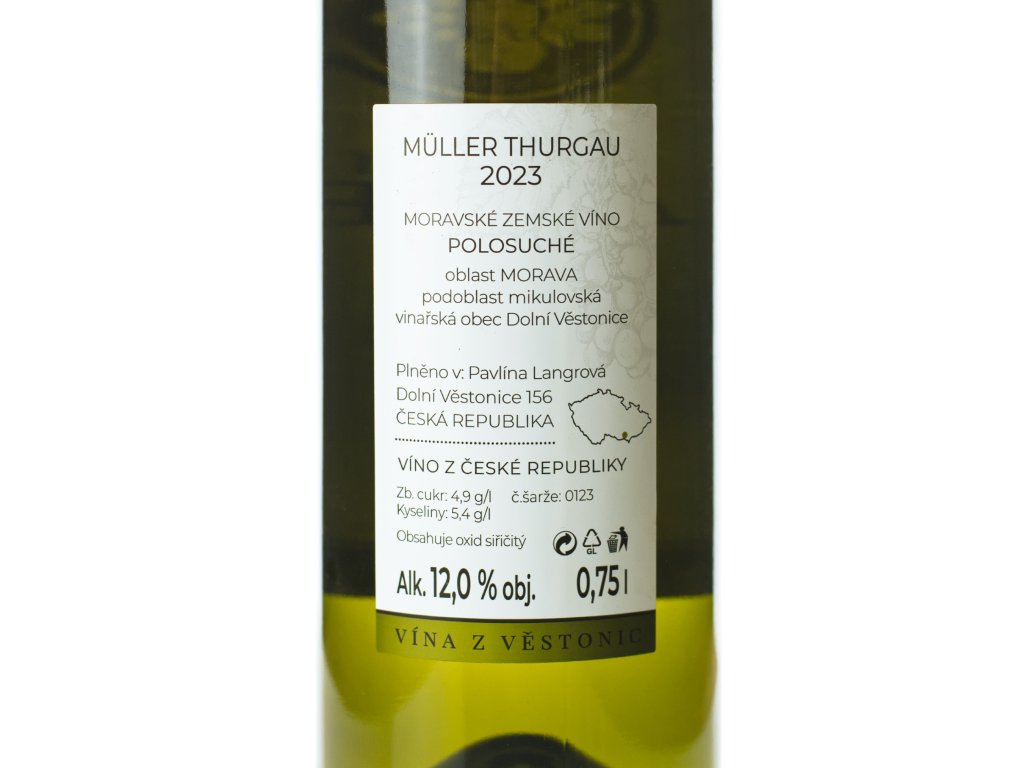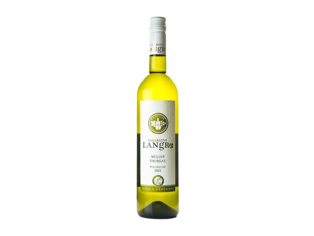 Müller Thurgau 2023 je bílé víno s typickými tóny zeleného jablka, broskve a jemnými květinovými nuancemi